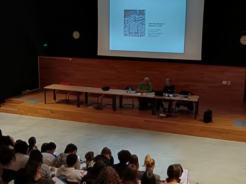 Quatre-vingts élèves de terminale qui suivent la spécialité Histoire-Géographie-Géopolitique et Science Politique au lycée Dupuy de Lôme ont rencontré Roger Fajnzylberg et Alban Perrin, auteurs de Les Cahiers d’Alter, ce que j’ai vu à Auschwitz publié au Seuil en 2025.